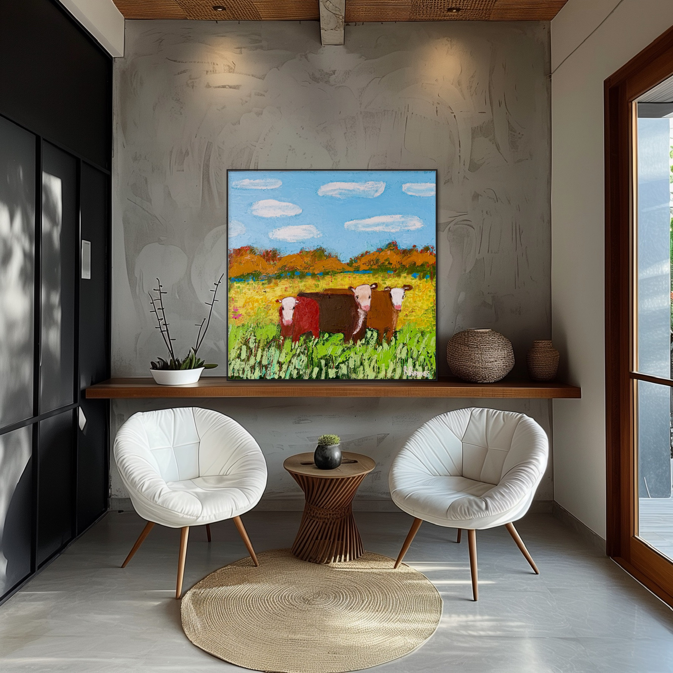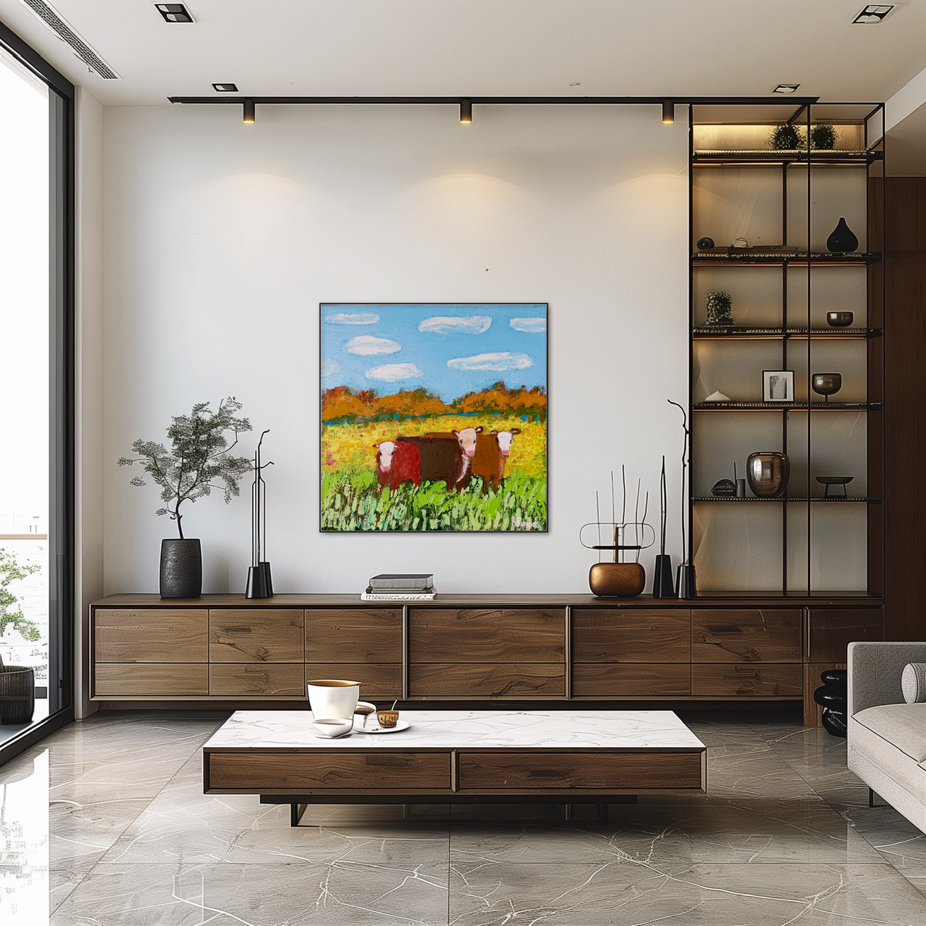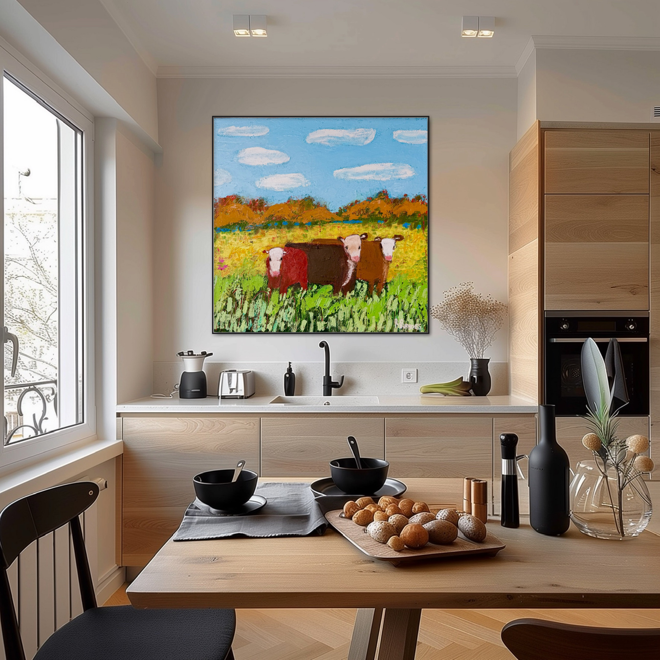 "The Happy Cattle" is an original oil painting on a stretched canvas 24"x 24" in (60.9 x 60.9cm). Unframed.