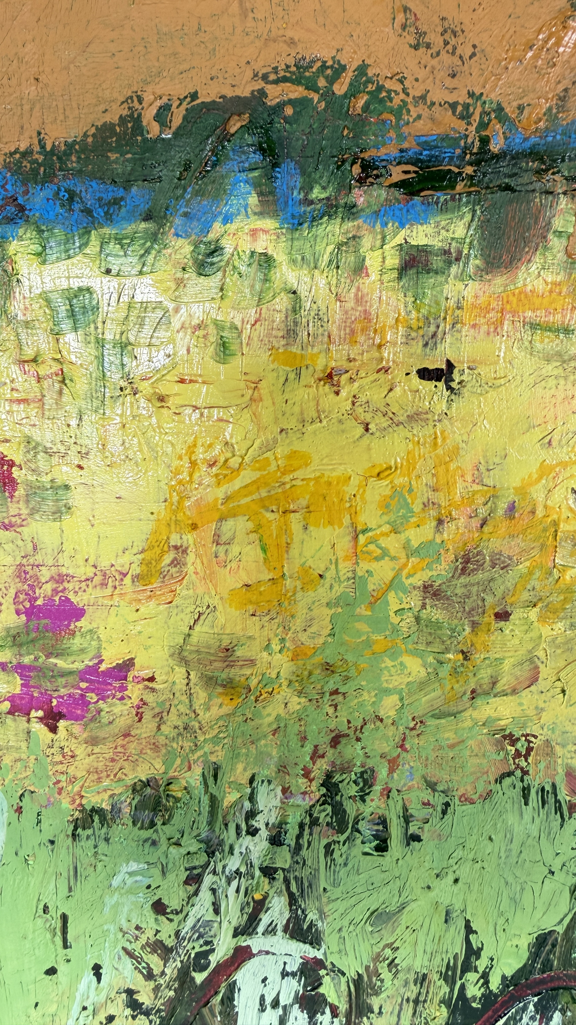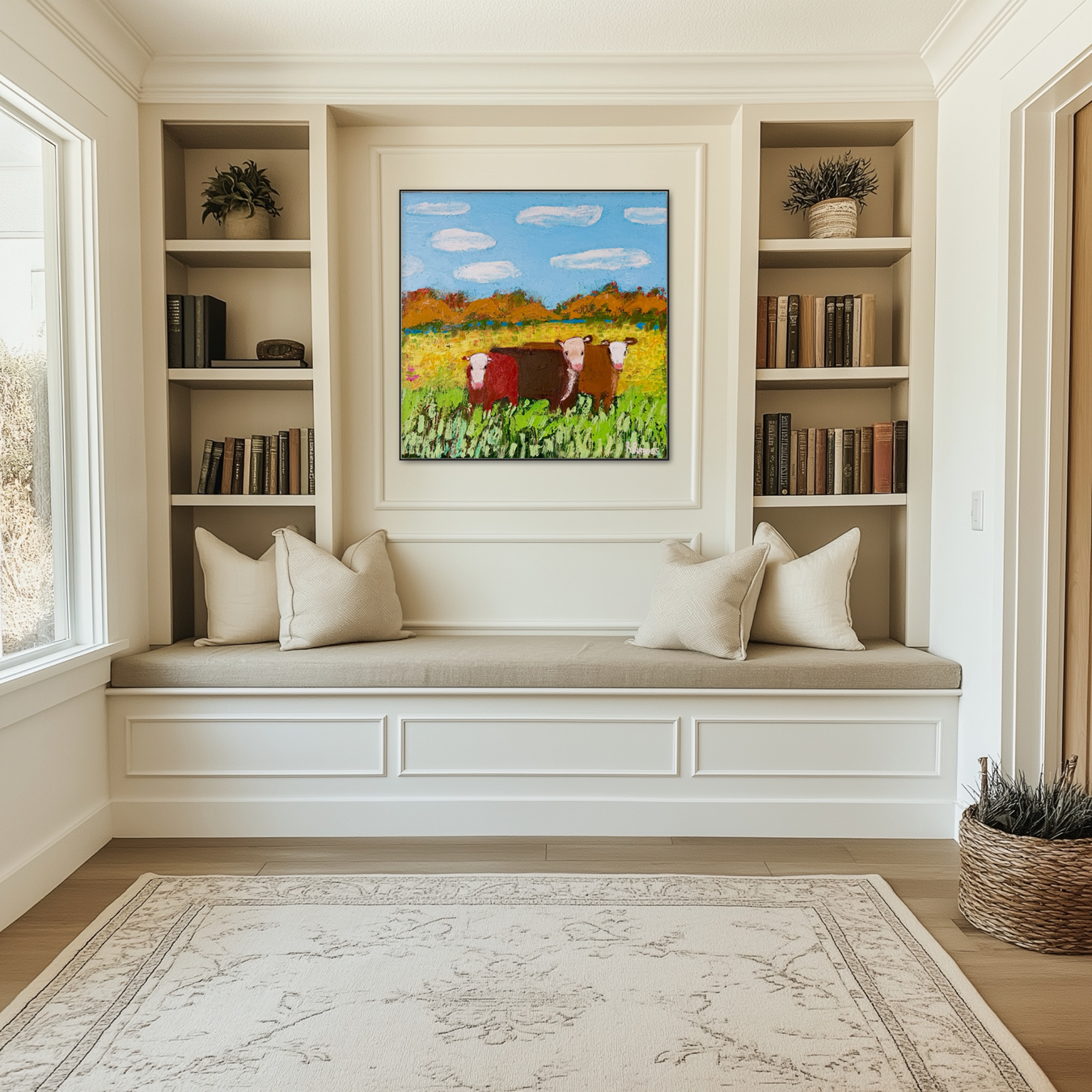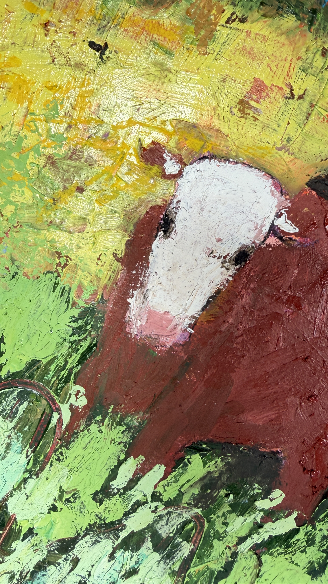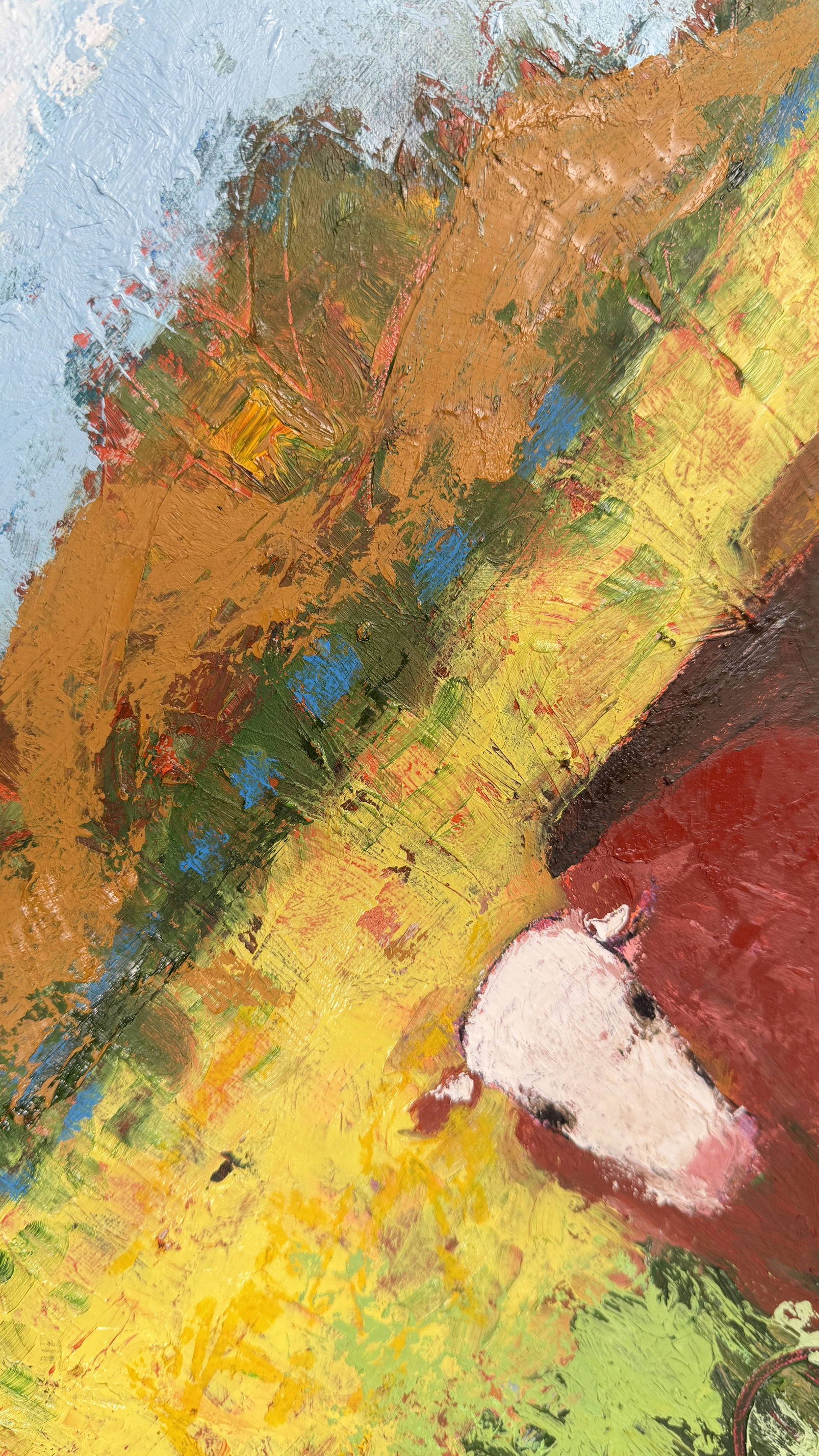 "The Happy Cattle" is an original oil painting on a stretched canvas 24"x 24" in (60.9 x 60.9cm). Unframed.